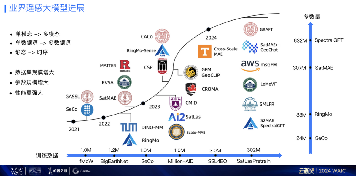 这张图展示了近年来发布的遥感大模型。大家可以看到,从2021年开始业界就有用无监督预训练的算法做遥感影像的识别,这里面有像SeCo这样的模型。随后越来越多的公司和机构参与进来,这里面有很多代表性的工作,比如2022年中国科学院空天院发布的RingMo模型,2023年Satlas模型,前不久复旦大学发布的GRAFT模型。这一幅图里面也可以看到几个明显趋势,模型的数据和参数的规模越来越大,性能越来越强。从最早的支持单模态的数据,到现在融合多模态的数据,从最早的只能覆盖单数据源的影像,到现在可以融合多数据源的影像,从早期的仅支持单张静态影像的解译,到融合整个时序影像的信息。整个趋势跟语言和视觉大模型的发展趋势是一致的,可以预见接下来肯定会出现性能更强,参数量更大的遥感大模型。