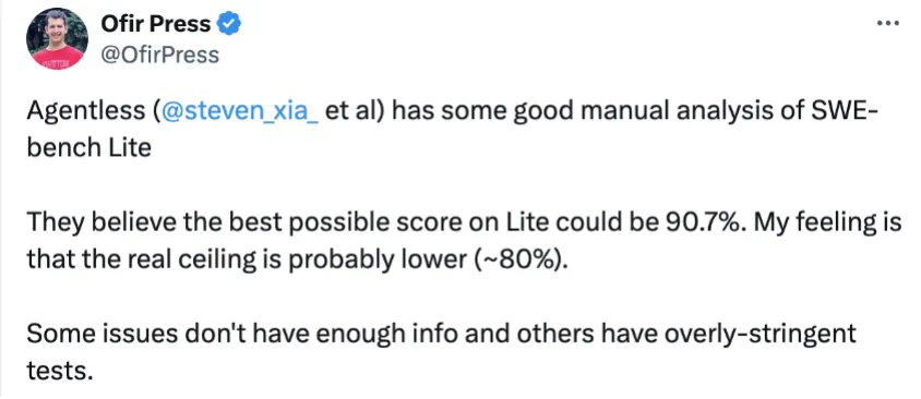 普林斯顿大学的研究人员,同时也是 SWE-Bench 的作者之一,Ofir Press 确认了他们的发现:“Agentless 对 SWE-bench Lite 进行了不错的手动分析。他们认为 Lite 上的理论最高得分可能是 90.7%。我觉得实际的上限可能会更低(大约 80%)。一些问题的信息不足,另一些问题的测试过于严格。”