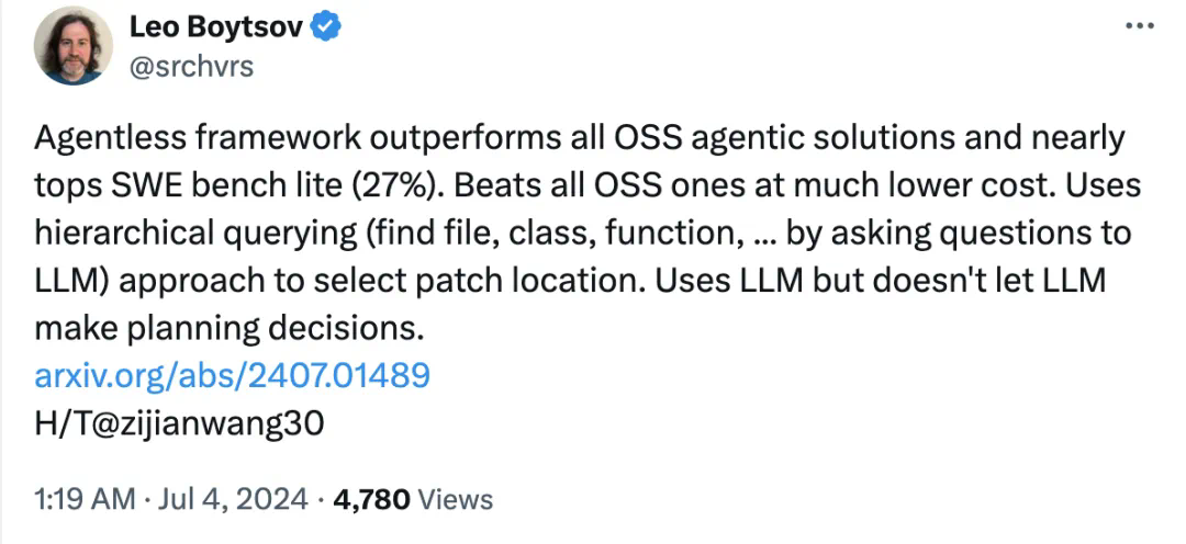 AWS 研究科学家 Leo Boytsov 表示:“Agentless 框架表现优异,超过所有开源 Agent 解决方案,几乎达到 SWE Bench Lite 最高水平(27%)。而且,它以显著更低的成本击败了所有开源方案。该框架采用分层查询方法(通过向 LLM 提问来查找文件、类、函数等)以确定补丁位置。虽然利用 LLM,但不允许 LLM 做出规划决策。”