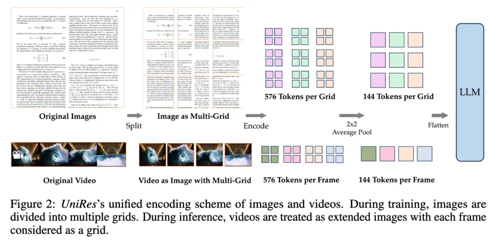 在模态对齐阶段,作者设计了一个名为 “UniRes” 的统一编码方案,用于同时处理图像和视频。UniRes 方案与 LLaVA-1.6 中的 AnyRes 编码方案类似,但去处了 base image 部分,针对每个 grid 分别一维化,并在每个网格内进行了 2×2 特征池化。这种方法确保了在将图像数据扩展到视频时,能够保持一致的表示形式。