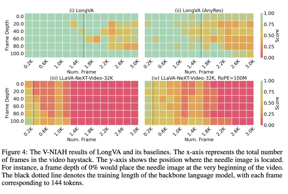 V-NIAH 测试结果显示,LongVA 在 2000 帧(每帧 144 个 token)以内的视觉大海捞针测试几乎全对, 在 3000 帧的尺度上也保持了不错的正确率 。有趣的是,和语言模型类似, 他们发现 LongVA 在 V-NIAH 上也存在一定程度的 Lost-In-The-Middle 现象。
