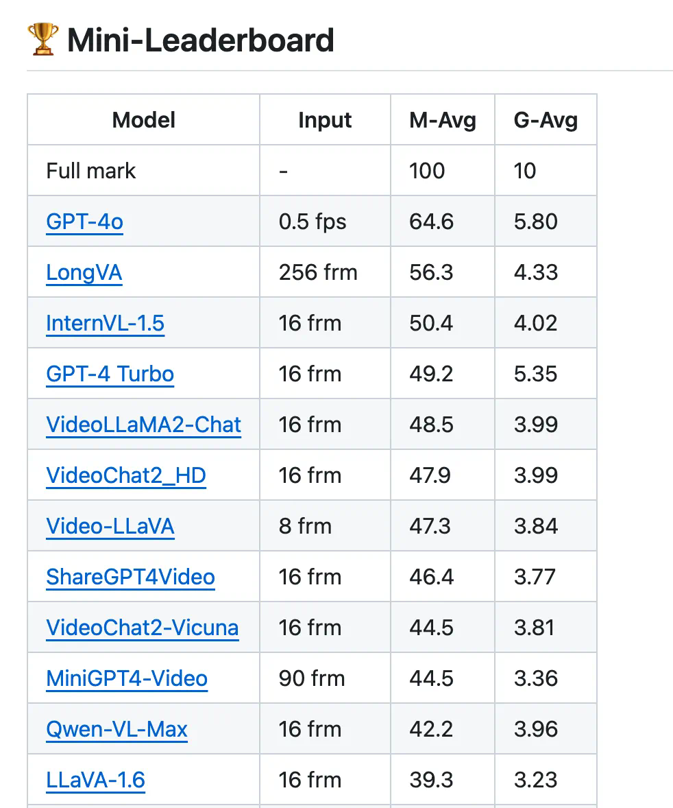 在智源联合北邮、北大和浙大等多所高校推出的 MLVU 基准测试中, LongVA 更是仅次于 GPT-4o, 位列最强的开源模型。