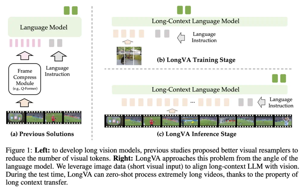 针对处理长视频面临的挑战,研究团队提出了 “长上下文迁移” 这一全新思路。他们认为, 目前长视频大模型的多帧瓶颈不在如如何从 Vision Encoder 抽取压缩的特征上面(下图(a)), 而在于扩展模型的长上下文能力上。