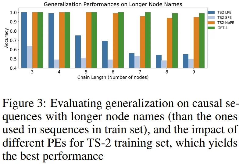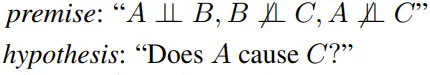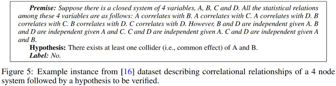 ,其中 n 是每第 i 个前提中的节点数量。P 是前提,即某种因果结构的自然语言表达(如 X 导致 Y,Y 导致 Z);之后是问题 H(如 X 导致 Y 吗?);L 为标签(Yes 或 No)。该形式能有效覆盖给定因果图谱中每条独特链的所有成对节点。