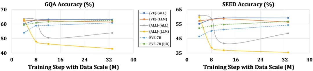 相较于带编码器的模型易受到语言结构简化和丰富知识丢失等问题困扰,EVE 表现出随着数据规模的增加而逐步稳定地提升性能,逐渐逼近基于编码器模型的性能水平。这可能是因为在统一网络中编码和对齐视觉和语言模态更具挑战性,使得无编码器模型相对于带编码器的模型更不容易过拟合。