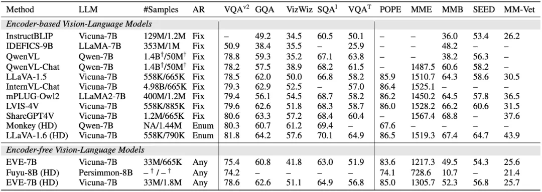 EVE 模型在多个视觉语言基准测试中明显优于同类型的 Fuyu-8B 模型,并且与多种主流的基于编码器的视觉语言模型表现相当。然而,由于使用大量视觉语言数据训练,其在准确响应特定指令方面存在挑战,在部分基准测试中表现有待提高。令人兴奋的是,通过高效的训练策略,可以实现无编码器的 EVE 与带编码器基础的视觉语言模型取得相当的性能,从根本上解决主流模型在输入尺寸灵活性、部署效率和模态容量匹配方面的问题。