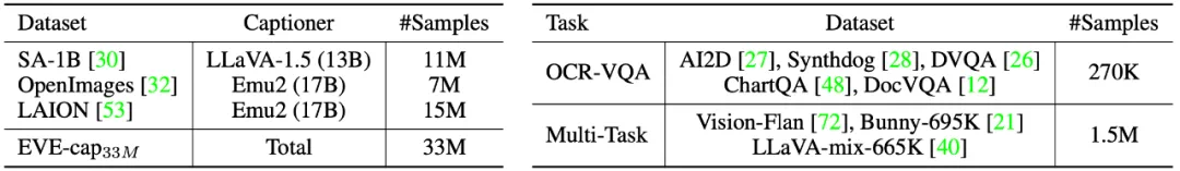 在监督微调阶段,使用 LLaVA-mix-665K 微调数据集来训练得到标准版的 EVE-7B,并整合 AI2D、Synthdog、DVQA、ChartQA、DocVQA、Vision-Flan 和 Bunny-695K 等混合数据集来训练得到高分辨率版本的 EVE-7B。