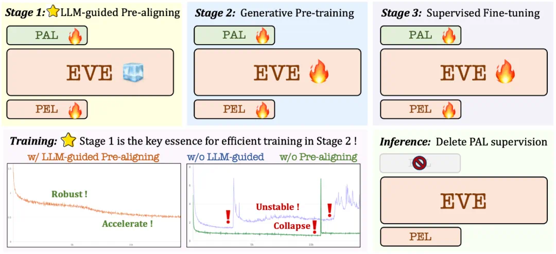 原生多模态的构建: EVE 完整地展现了如何高效稳定地构建原生多模态模型,这为之后整合更多模态(如音频、视频、热成像、深度等)开辟了透明和切实可行的道路。核心思想是在引入大规模统一训练之前,先通过冻结的大语言模型对这些模态进行预对齐,并利用相应的单模态编码器和语言概念对齐进行监督。