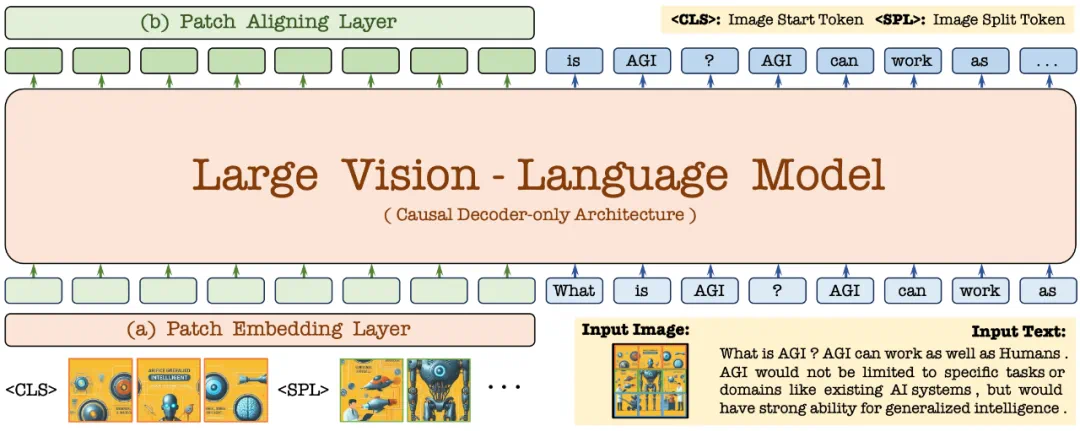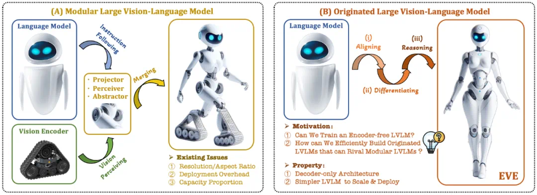 当前的视觉语言模型(VLM)通常依赖视觉编码器(Vision Encoder, VE)来提取视觉特征,再结合用户指令传入大语言模型(LLM)进行处理和回答,主要挑战在于视觉编码器和大语言模型的训练分离。这种分离导致视觉编码器在与大语言模型对接时引入了视觉归纳偏置问题,例如受限的图像分辨率和纵横比,以及强烈的视觉语义先验。随着视觉编码器容量的不断扩大,多模态大模型在处理视觉信号时的部署效率也受到极大限制。此外,如何找到视觉编码器和大语言模型的最佳容量配置,也变得越来越具有复杂性和挑战性。