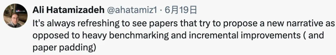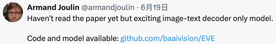 英伟达高级研究员 Ali Hatamizadeh 表示,EVE 令人耳目一新,尝试提出全新的叙事,区别于构建繁杂的评测标准和渐进式的视觉语言模型改进。