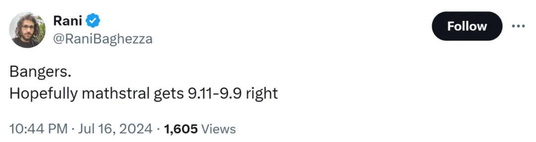 网友很好奇,Mathstral能不能搞定「9.11和9.9谁大」这一问题。