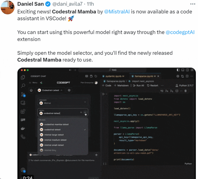 模型权重:https://huggingface.co/mistralai/mamba-codestral-7B-v0.1