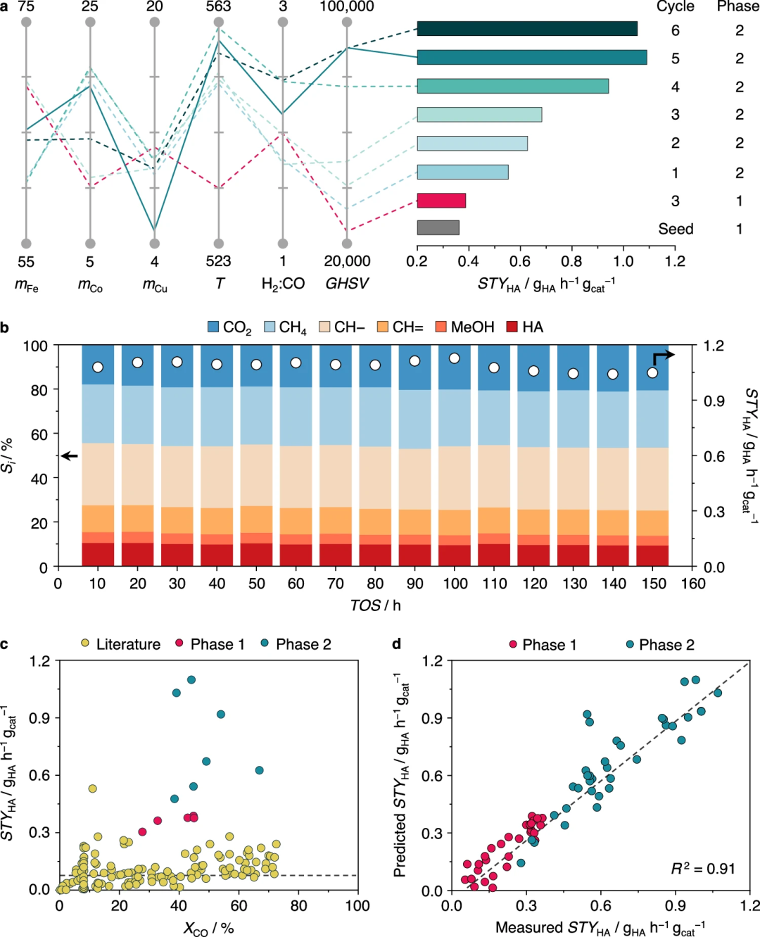 随后,在第 3 阶段,通过同时最大化 STYHA 并最小化二氧化碳和甲烷的综合选择性,将该方法扩展到多目标能力。每个阶段进行由六次实验组成的迭代循环,直到达到目标性能指标或达到饱和状态。