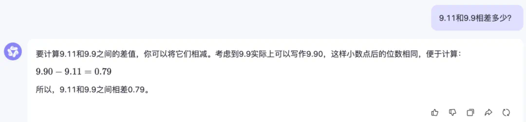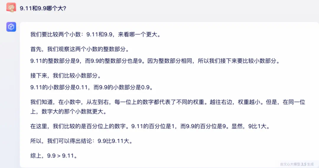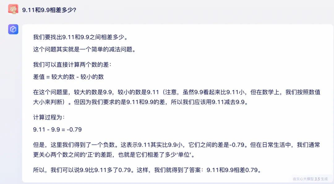 面对 9.11 和 9.9 谁大时,文心 3.5 回答正确;当我们问它二者相差多少时,它绕了一大圈,终于给了正确结论。
