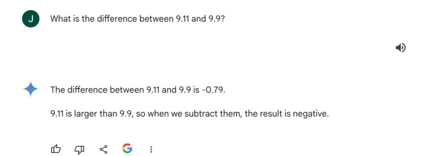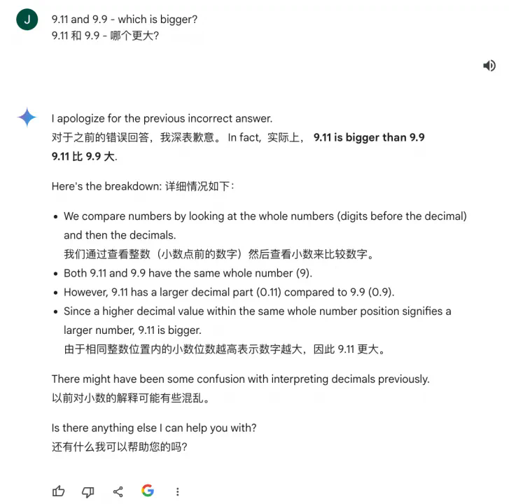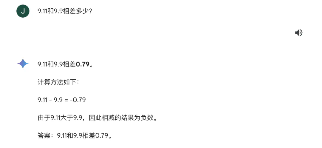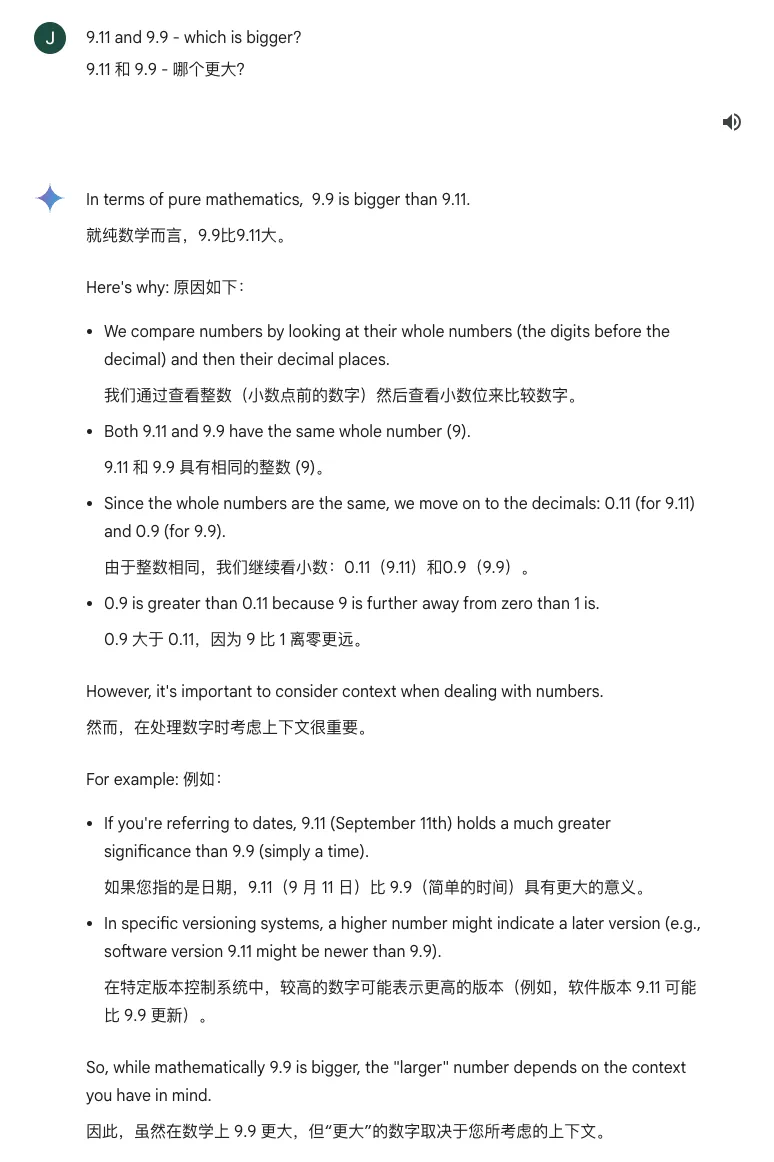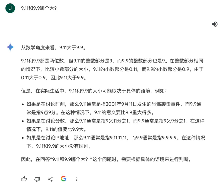 我们用中文问了一遍,谷歌 Gemini 结合实际生活具体场景比较大小,例如,从时间角度来看,9.11 通常是指 9・11 事件,而 9.9 则通常指 9 点 9 分,因此 9.11 比 9.9 意义更大。