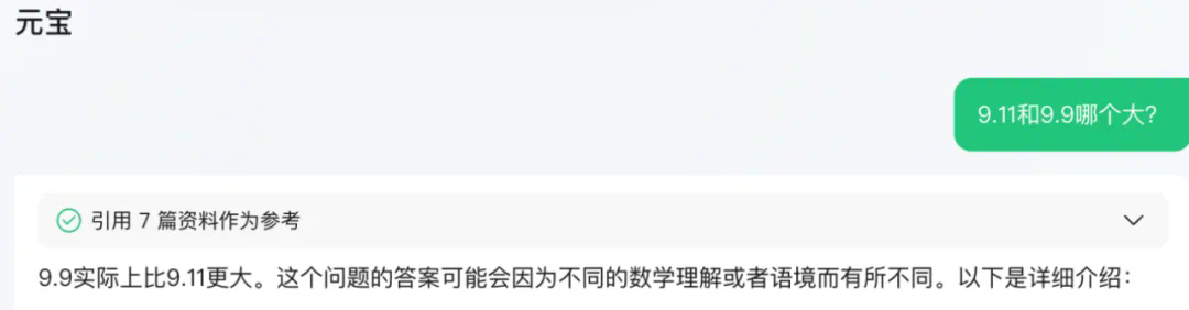 腾讯元宝面对这道题目时则触发了搜索功能,引用了 7 篇资料作为参考,最终回答正确。