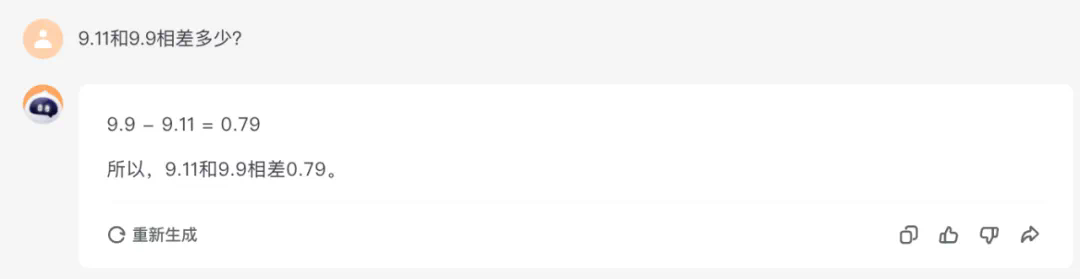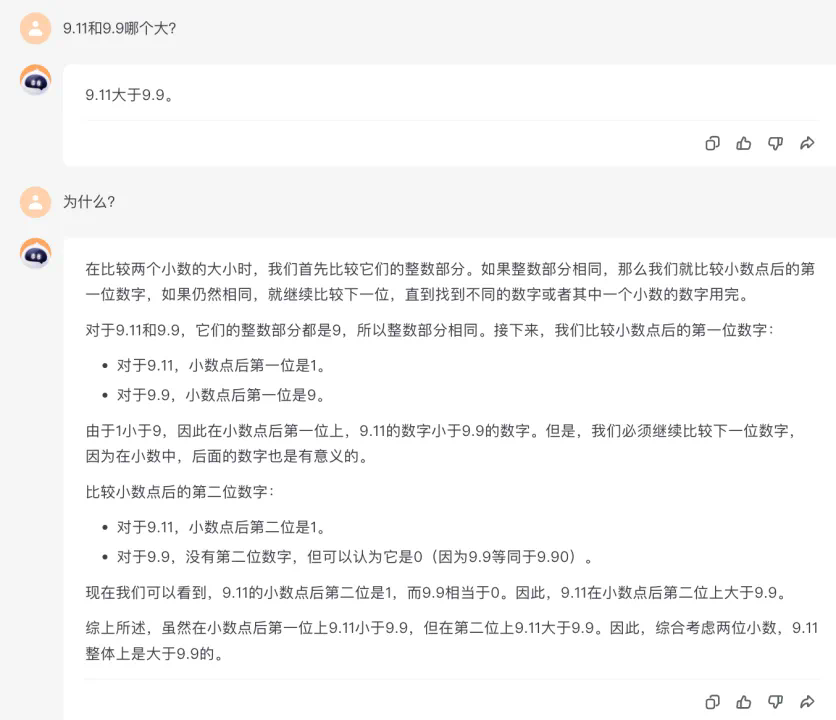 此外,在处理类似「9.11 比 9.9 大」的场景时,大模型通常会通过分词器 tokenizer 进行处理。分词器在解析这类表达时,可能会把数字辨认为日期或版本号进行比较,最终导致回答错误。这种处理方式是由分词器的特定算法和机制决定的。