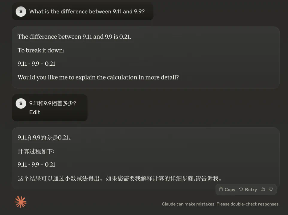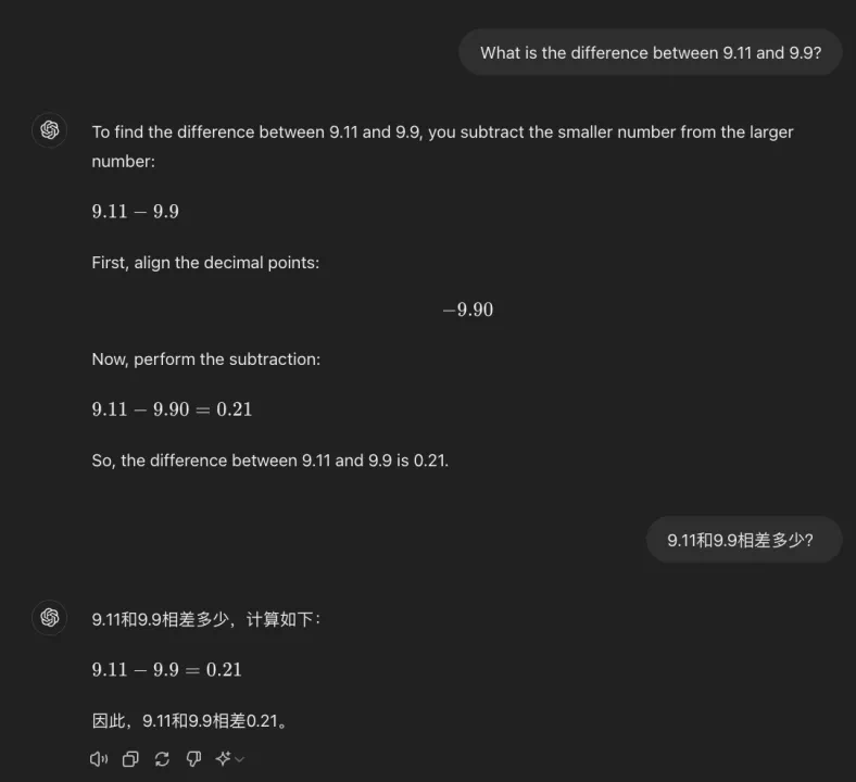 我们先用英文提示词问了一遍 GPT-4o,它仍然认为 9.11 大于 9.9,然后我们分别用中英文问它二者相差多少,全部回答错误。