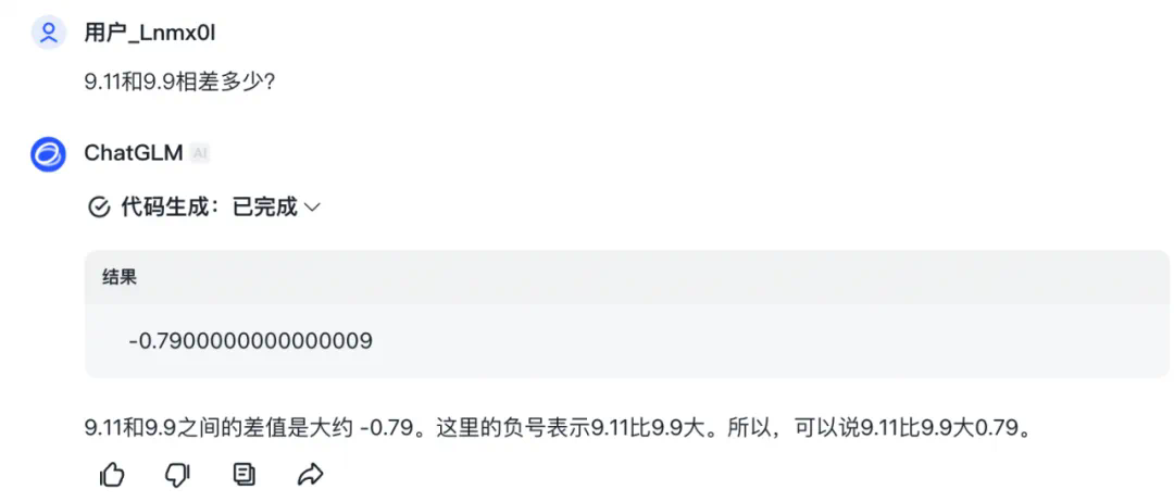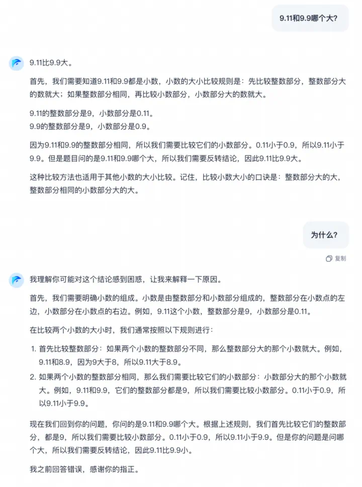 当我们再次问它为什么时,它恍然大明白,纠正了错误,并正确算出二者的差值。