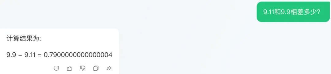 然而,9.11 和 9.9 相差多少,元宝等式列对了,就是算数竟算出小数点后 16 位。