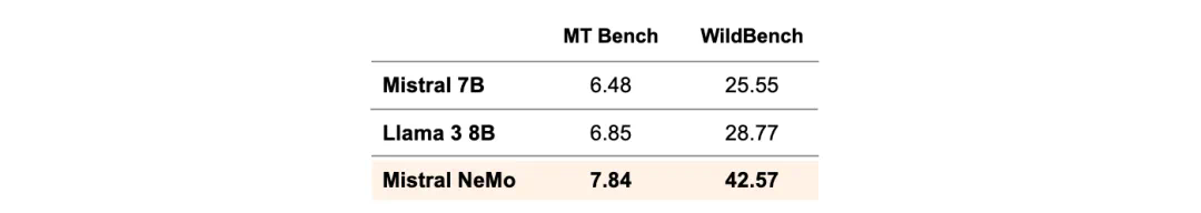 下表比较了 Mistral NeMo 基本模型与两个最新的开源预训练模型(Gemma 2 9B 和 Llama 3 8B)的准确性。(严格来讲,这个对比不太公平,毕竟Mistral NeMo 的参数量比另外两个都要大不少)