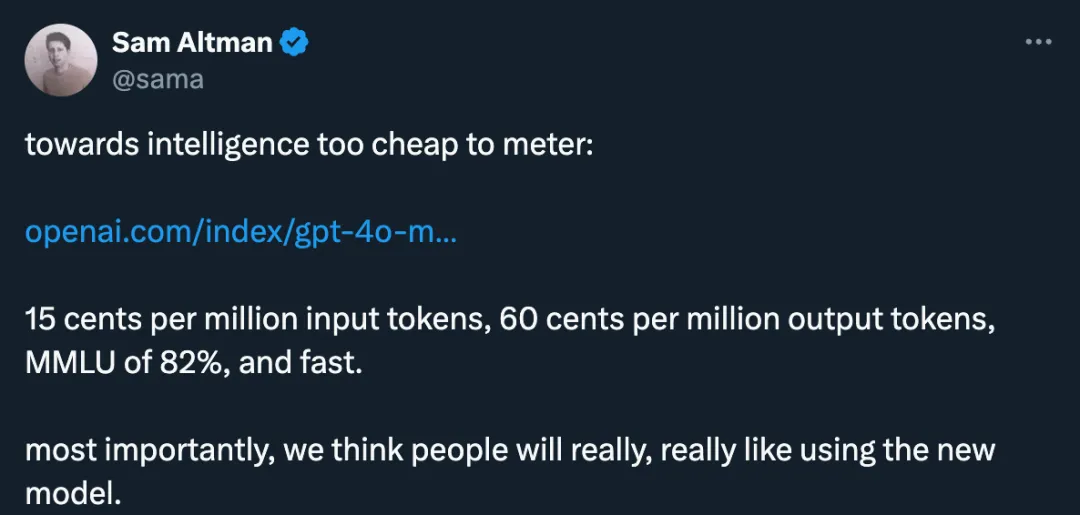 OpenAI CEO 山姆・奥特曼对此的形容是:通往智能的成本已经「too cheap to meter」。