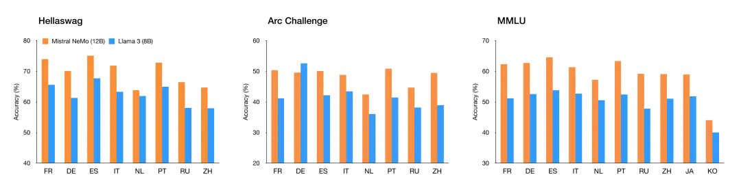 图 1:Mistral NeMo 在多语言基准测试中的表现。