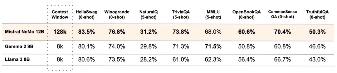 表 1:Mistral NeMo 基本模型与 Gemma 2 9B 和 Llama 3 8B 的性能比较。