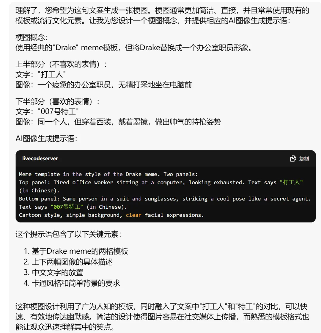 首先,给 Claude 3.5 sonnet 输入下面要求,让他生成梗图的提示语: