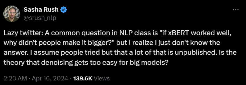 在 2018-2021 年期间,出现了一种隐含的范式转变:从单任务微调转变成大规模多任务模型。这慢慢地将我们导向了统一的 SFT 模型,这就是我们如今看到的通用模型。使用 BERT 却很难做到这一点。我认为这与「去噪」关系不大。对于还想使用这样的模型(即 T5)的人,他们找到了一种重新表达去噪预训练任务的方法,这使得如今 BERT 式模型已经基本上被弃用了,因为我们已有更好的替代方案。