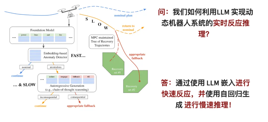 大型语言模型(LLM),具有零样本的泛化能力,这使得它们有希望成为检测和排除机器人系统分布外故障的技术。然而,想让大型语言模型真正发挥作用,需要解决两个难题:首先,LLM 需要很多计算资源才能在线应用;其次,需要让 LLM 的判断能够融入到机器人的安全控制系统中。