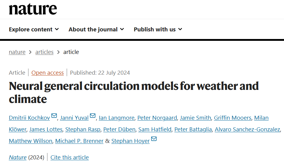 相关研究以「Neural general circulation models for weather and climate」为题,于 7 月 22 日发布在《Nature》上。