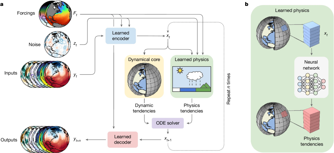 动力学 core 模拟在重力和科里奥利力(Coriolis Force)作用下大尺度流体运动和热力学过程。学习物理模块利用神经网络预测未解决过程对模拟场的影响,如云的形成、辐射传输、降水和亚网格尺度动力学。