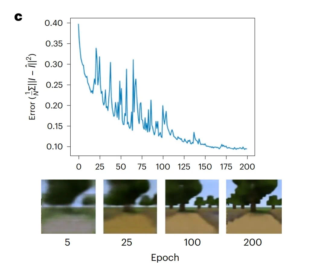 预测编码器通过最小化实际观测值与预测观测值之间的均方误差来近似预测编码。预测编码器在 82,630 个样本上进行了 200 个 epoch 训练,使用了具有 Nesterov 动量的梯度下降优化,权重衰减为 5 × 10^(-6),学习率为 10^(-1),并通过 OneCycle 学习率调度进行调整。优化后的预测编码器预测图像与实际图像之间的均方误差为 0.094,具有良好的视觉保真度(图 1c)。
