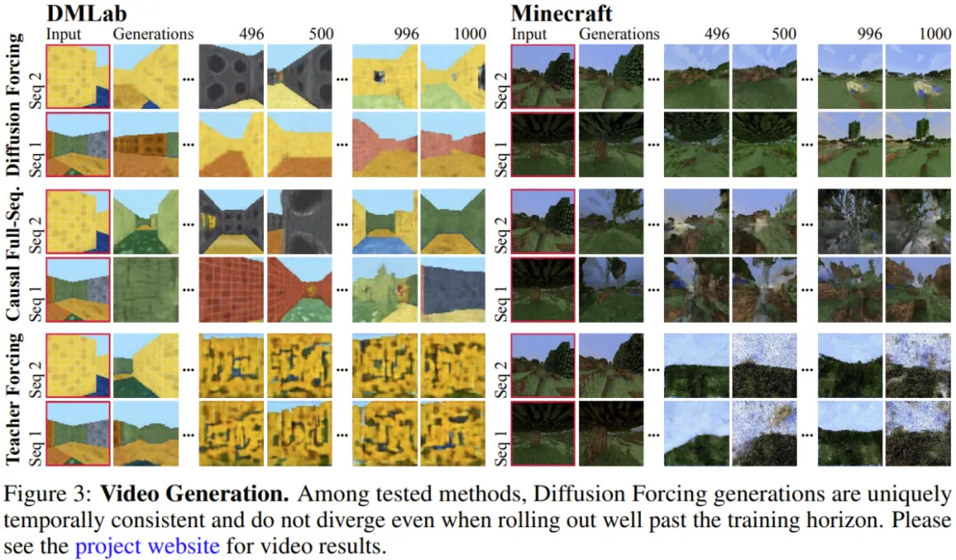 如下所示,扩散强制在一致性和稳定性方面都明显胜过全序列扩散和教师强制这两种方法。