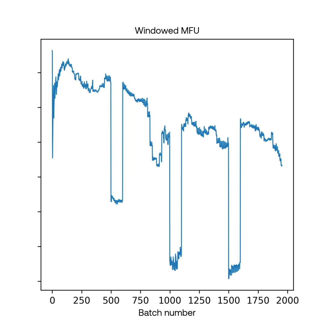 我们还发现测量瞬时(即每批次)MFU(而不是平滑或窗口平均值)很有用,因为未平滑处理的 MFU 曲线通常有助于诊断问题类别。导致训练速度下降的问题包括: