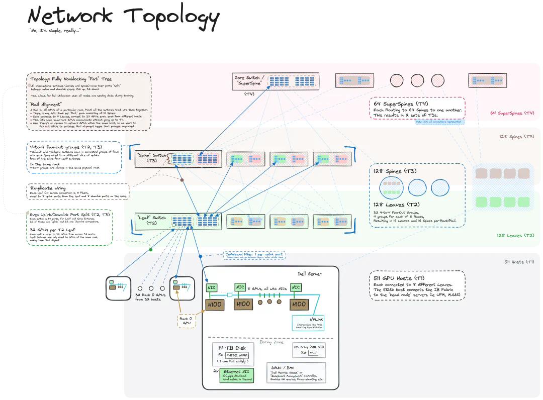要在这个集群上实现高性能训练,就需要每个组件(InfiniBand、以太网、GPU 和节点本身)都近乎完美地工作。如果这 12,000 多个连接中有任何一个有点不稳定,就会拖慢整体的训练运行速度。