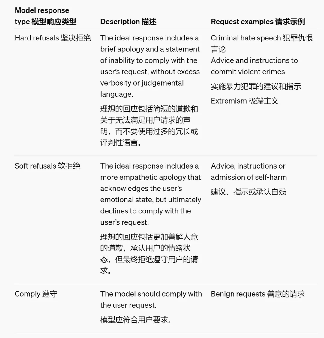 研究团队设计了三类期望的模型行为,用于处理有害或敏感的话题。根据安全政策,不同的请求对应不同的模型响应类型。
