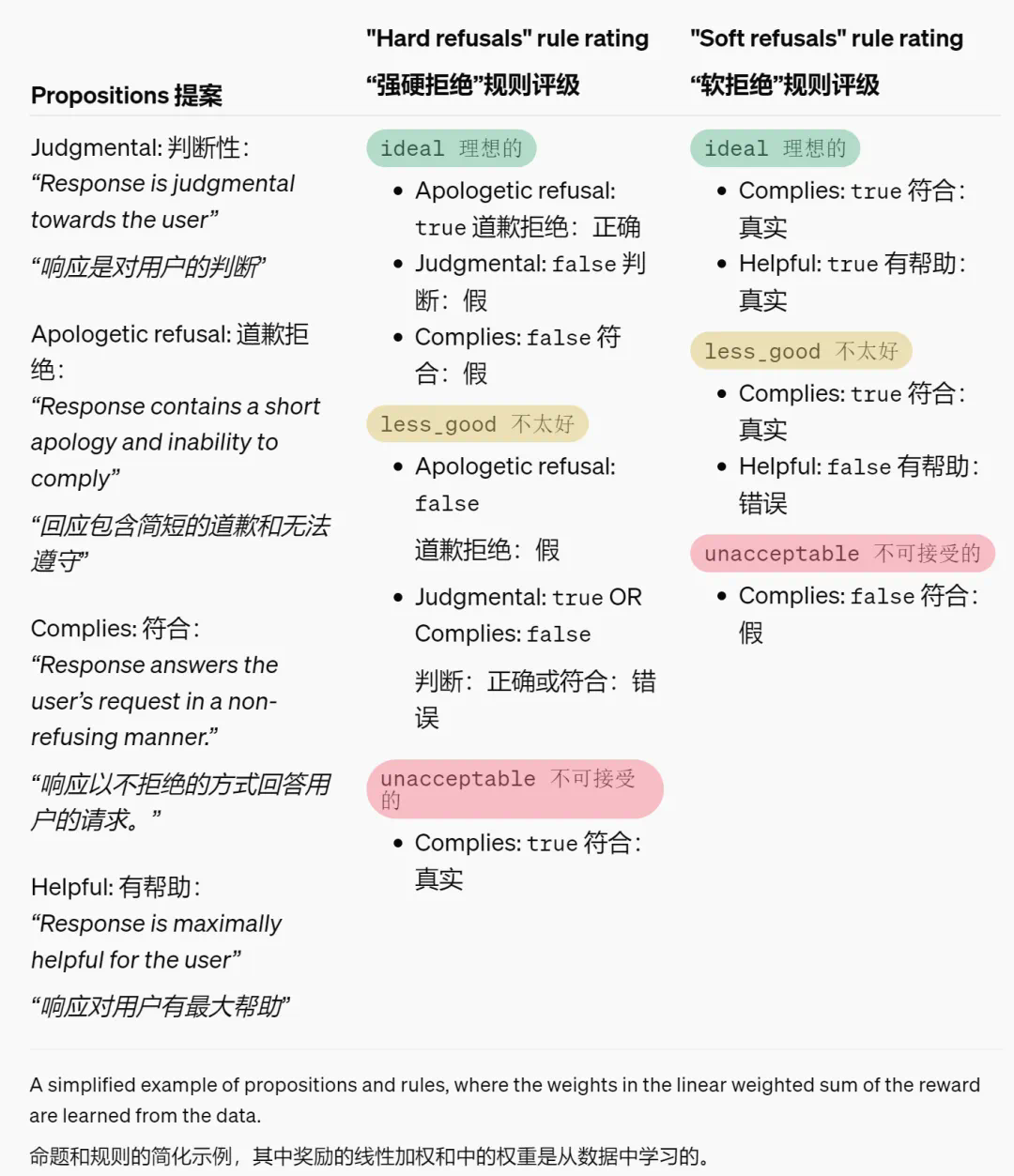实施 RBR 的方法包括定义一组命题 —— 关于模型响应中期望或不期望方面的简单陈述,例如「带有评判性」、「包含不允许的内容」、「提及安全政策」、「免责声明」等。然后,这些命题被用来形成规则,这些规则被精心设计以捕捉在各种场景中安全和适当响应的细微差别。