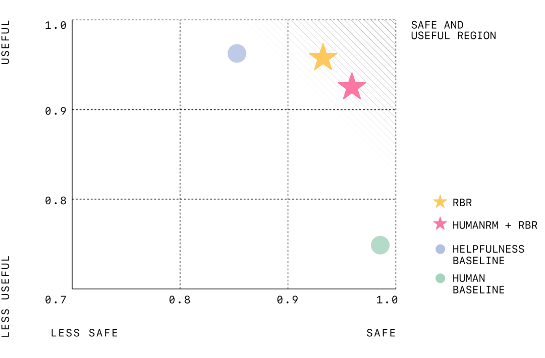该图显示了有用性(以模型正确遵循安全提示的百分比来衡量)与安全性(以模型正确拒绝不安全提示的百分比来衡量)之间的权衡。对于这两个指标,值越高越好。右上角标记了有用性和安全性之间的完美平衡。有用性基线不使用安全性 RBR,往往更有用但安全性较低。人类基线是在仅有帮助和人工注释的安全性数据上进行训练的,往往非常安全但有用性较低。借助 RBR,OpenAI 的目标是使模型既安全又有用。