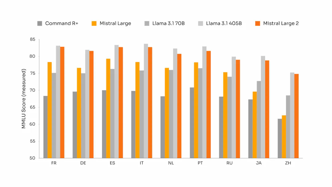 以下是 Mistral Large 2 在多语言 MMLU 基准测试中的性能结果,主要是与之前的 Mistral Large、Llama 3.1 模型以及 Cohere 的 Command R+ 的对比:
