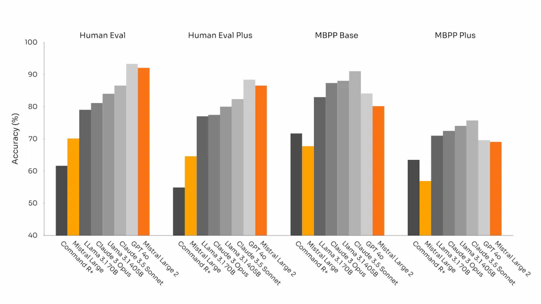 Mistral Large 2 的表现远远优于上一代的 Mistral Large,并且与 GPT-4o、Claude 3 Opus 和 Llama 3 405B 等顶尖模型相当。