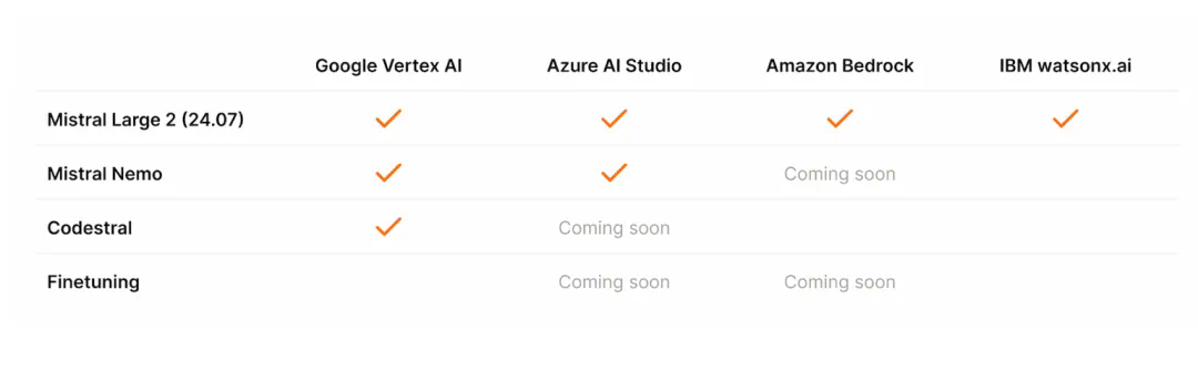 此外,Mistral AI 与云服务提供商都有合作,Mistral Large 2 将很快登陆这些平台。Mistral AI 扩大了与 Google Cloud Platform 的合作,通过 Managed API 将 Mistral AI 的模型引入 Vertex AI。与此同时,还可以在 Amazon Bedrock、Azure AI Studio 和 IBM watsonx.ai 上找到。