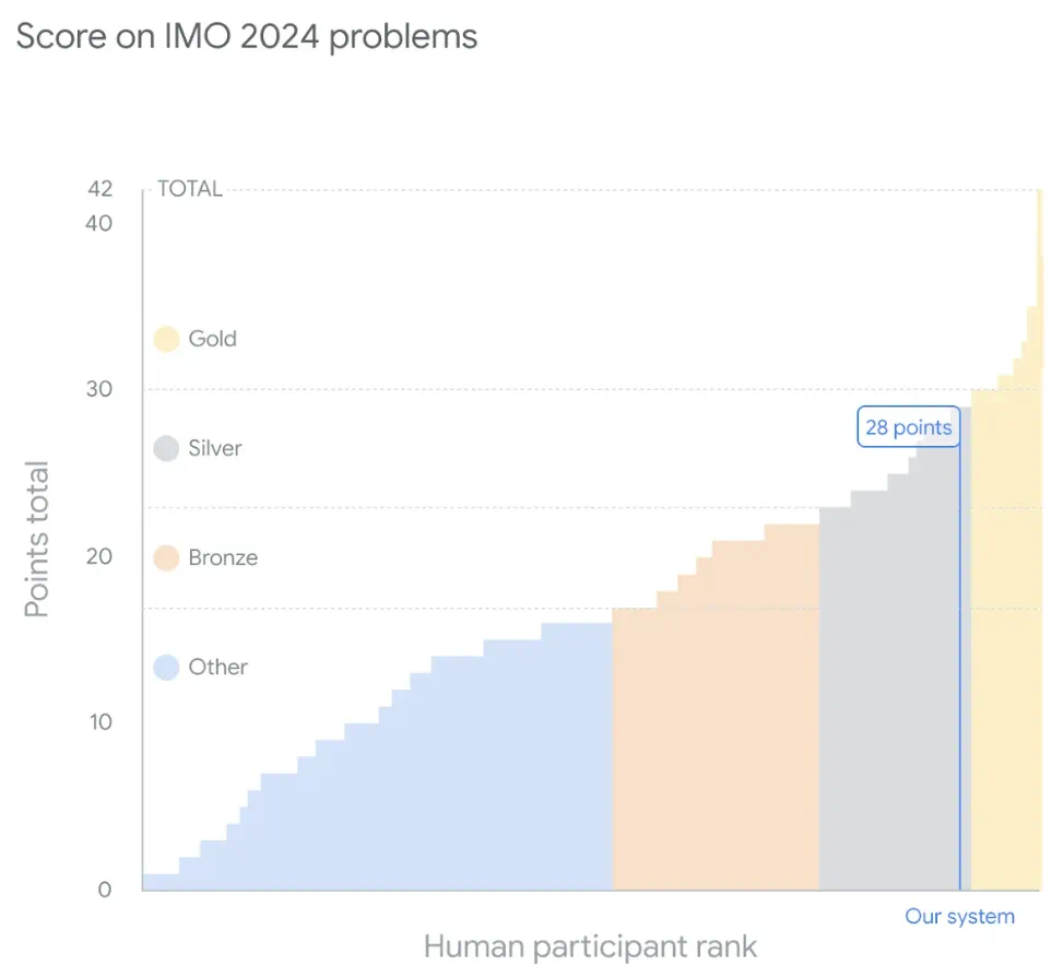 该图显示了谷歌 DeepMind 的人工智能系统在 IMO 2024 上相对于人类竞争对手的表现。在总分为 42 分的情况下,该系统获得了 28 分,达到了与比赛银牌获得者相同的水平。另外,今年 29 分是能拿金牌的。