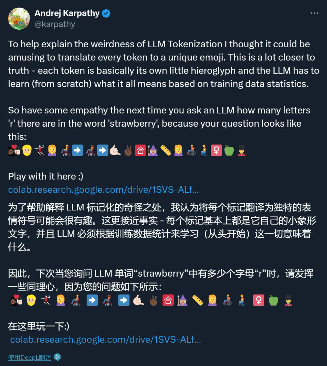 文章来源于互联网:为什么AI数不清Strawberry里有几个 r?Karpathy:我用表情包给你解释一下