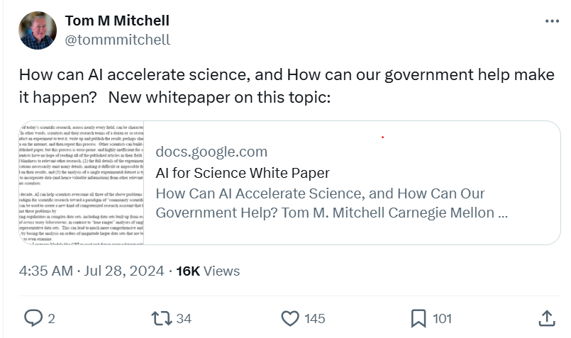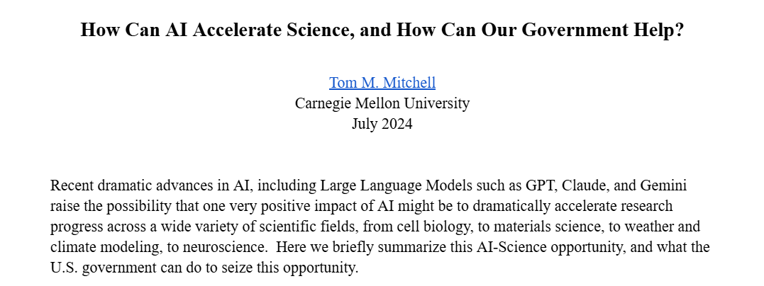 近日,卡内基梅隆大学(Carnegie Mellon University)教授,有着「机器学习之父」之称的 Tom M. Mitchell 撰写了新的 AI for Science 白皮书,重点讨论了「人工智能如何加速科学发展?美国政府如何帮助实现这一目标?」这一主题。