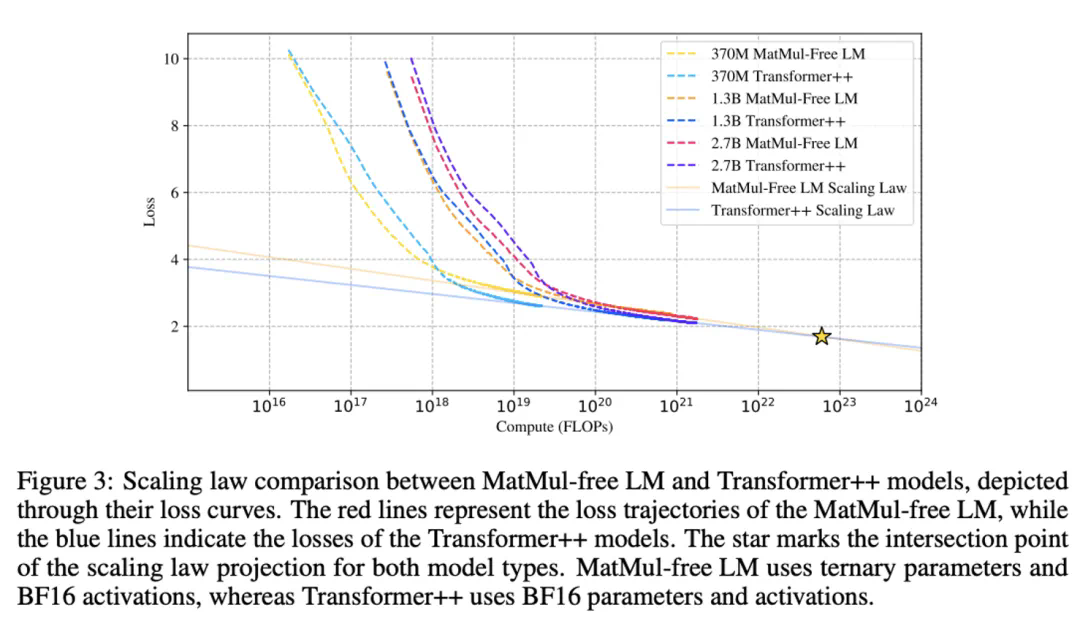 该论文发现,随着模型规模的扩大,无矩阵乘法模型与传统 Transformer 模型性能之间的差距越来越小,并有可能在超大规模模型上超越后者。来源:Rui-Jie Zhu et. al,Scalable MatMul-free Language Modeling,arxiv.org/pdf/2406.02528