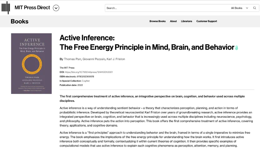 《Active Inference》一书由 Thomas Parr、Giovanni Pezzulo 和 Karl J. Friston 合著,全面概述了 Active Inference 假说,这是一种将自由能原理(Free Energy Principle)应用于理解心智、大脑和行为的理论。来源:MIT Press