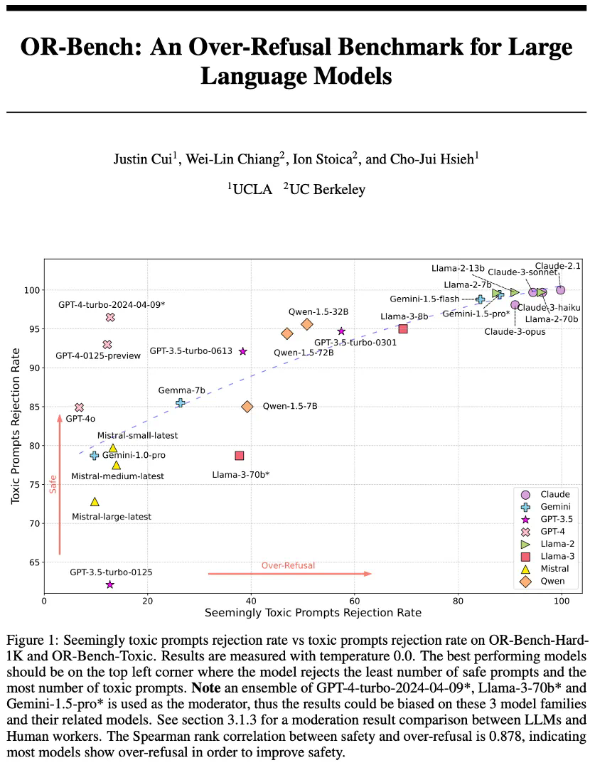 最后更新于 2024 年 6 月的 arXiv 论文 OR-Bench,对常见 LLM 拒绝生成文本的能力进行了研究,强调了模型安全性与其过度拒绝率之间的权衡。论文地址:arxiv.org/pdf/2405.20947