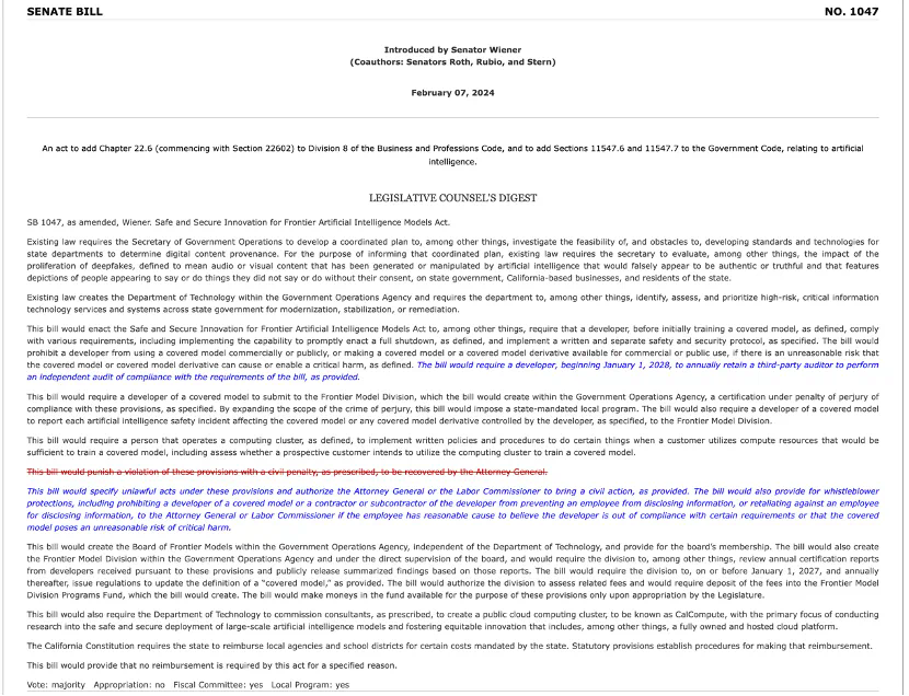 加州正在审议中的法案 SB 1047,该法案旨在规范前沿人工智能模型的开发和使用,例如要求开发者在训练前满足特定安全要求,并进行合规性审计等。来源:leginfo.legislature.ca.gov